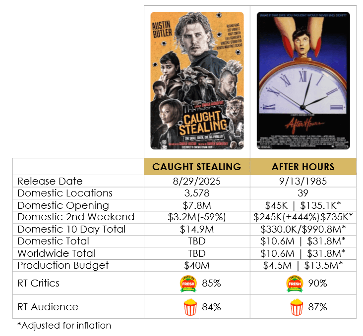 We expect it to wind up earning around $20.0M domestic and $34M worldwide, which is crushingly below the $100M worldwide that it would have needed to be profitable. We think it’s interesting to compare Aronofsky’s CAUGHT STEALING to Martin Scorsese’s AFTER HOURS, another offbeat comedy made by a director best known for his hard-hitting dramas.