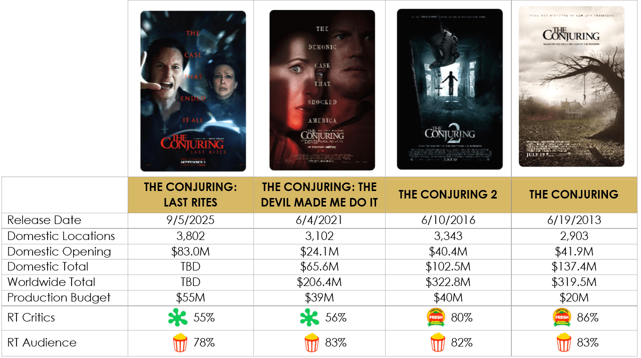 Having an all-time high production budget of $55M for a THE CONJURING Universe movie, Warner Bros. spent lavishly to give the Warrens a fitting sendoff. LAST RITES needs to earn $140M in worldwide ticket sales to be profitable, and after this weekend’s excellent start, it will surely get there. Note that the previous three THE CONJURING movies generated 64% of their total box office from international markets. Here is how LAST RITES compares with the other three THE CONJURING movies.