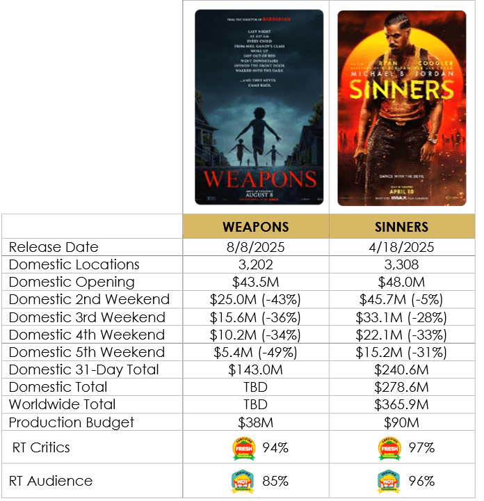This has been a great year for horror from Warner Bros., having landed four first-place scary movies in the 36 weeks of the year. In April, SINNERS was the #1 movie in its first two weekends, FINAL DESTINATION BLOODLINES won in its opening weekend in May, and WEAPONS was the top movie over the last four weekends before being replaced now by THE CONJURING: LAST RIGHTS.