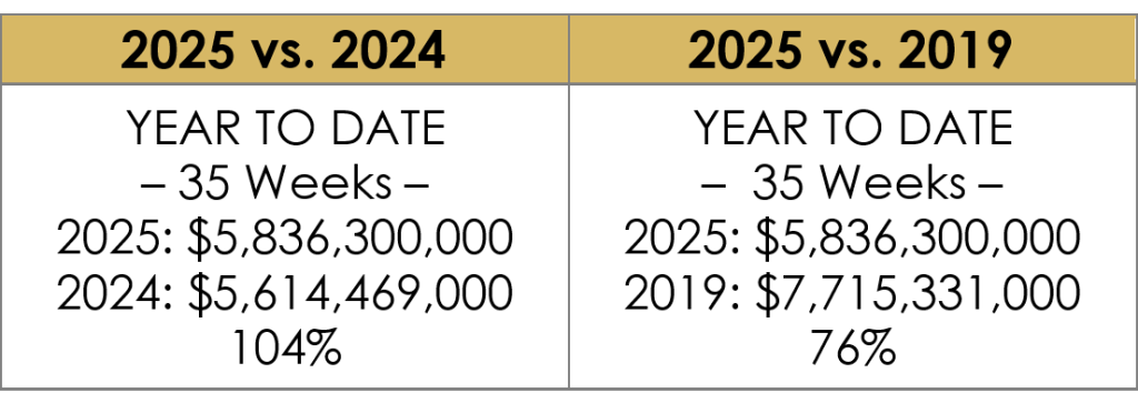 After 35 weeks, the 2025 domestic box office stands at 104% compared to the same point in 2024 and 76% compared to 2019.